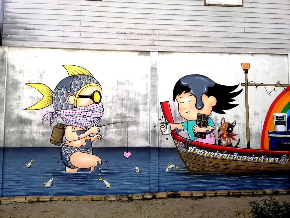 ลายเซ็นของศิลปิน และปลุกพลังผู้ประกอบการรุ่นใหม่ของภูเก็ต ด้วยภาพจิตรกรรมฝาผนังที่ใช้ลายเส้นและคาแรคเตอร์การ์ตูนแนวแฟนตาซี แต่งแต้มด้วยสีสันสดใส