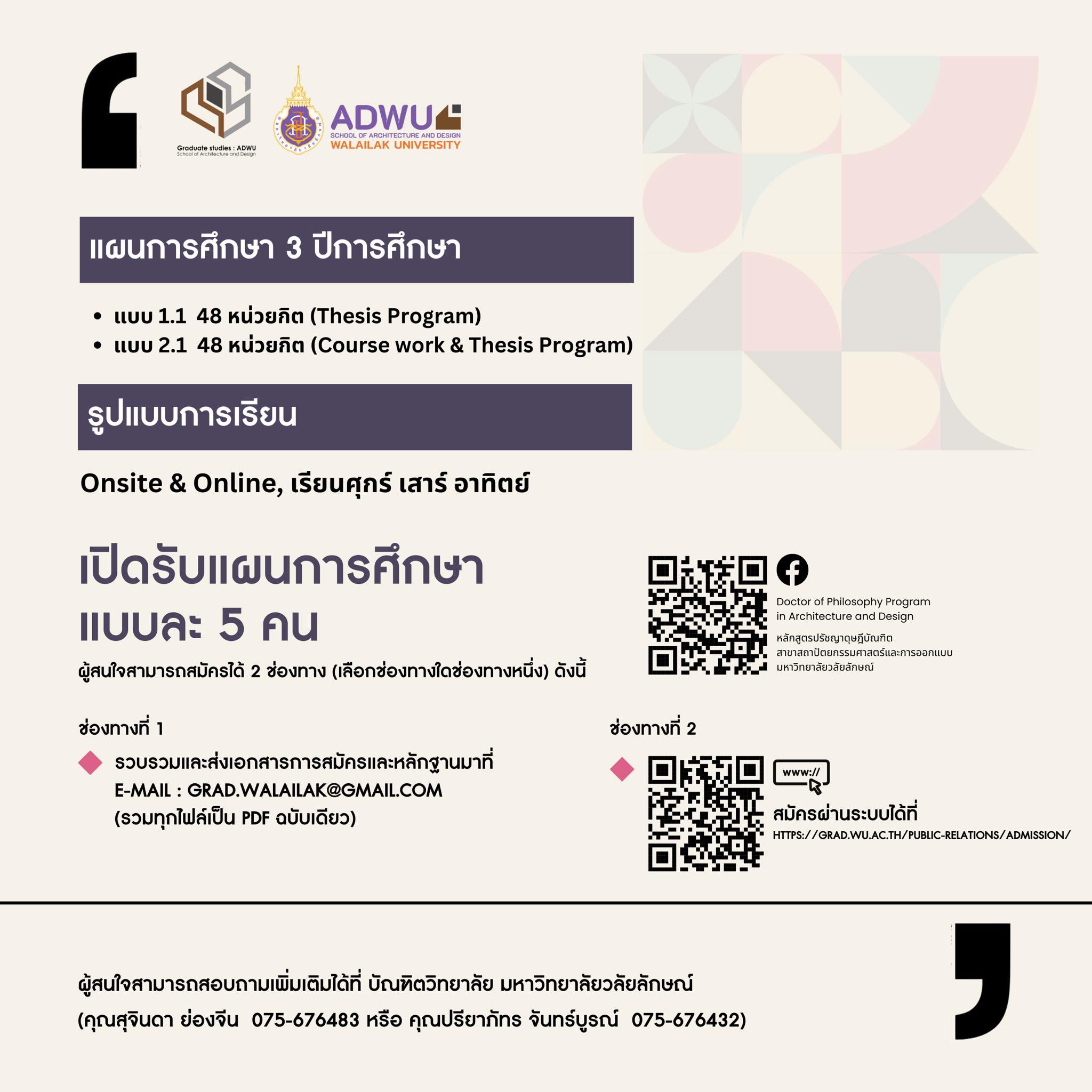 ผู้สนใจสามารถสอบถามเพิ่มเติมได้ที่บัณฑิตวิทยาลัย มหาวิทยาลัยวลัยลักษณ์