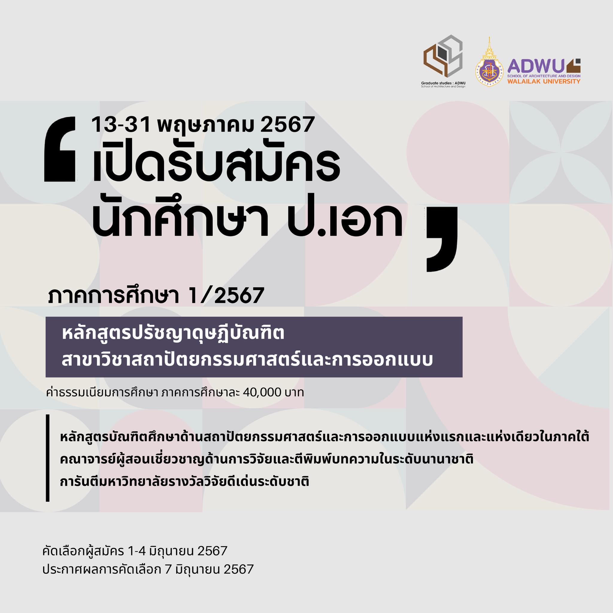 เปิดรับสมัครนักศึกษา ป.เอก อย่างเป็นทางการ ในภาคการศึกษาที่ 1 ปีการศึกษา 2567 ของหลักสูตรปรัชญาดุษฎีบัณฑิต สาขาวิชาสถาปัตยกรรมศาสตร์และการออกแบบ มหาวิทยาลัยวลัยลักษณ์ หลักสูตรบัณฑิตศึกษาด้านสถาปัตยกรรมศาสตร์และการออกแบบแห่งแรกและแห่งเดียวในภาคใต้ คณาจารย์ผู้สอนเชี่ยวชาญด้านการวิจัยและตีพิมพ์บทความในระดับนานาชาติ และการันตีมหาวิทยาลัยรางวัลวิจัยดีเด่นระดับชาติ เปิดรับสมัคร 13-31 พฤษภาคม 2567 คัดเลือกผู้สมัคร 1-4 มิถุนายน 2567 และประกาศผลการคัดเลือก 7 มิถุนายน 2567