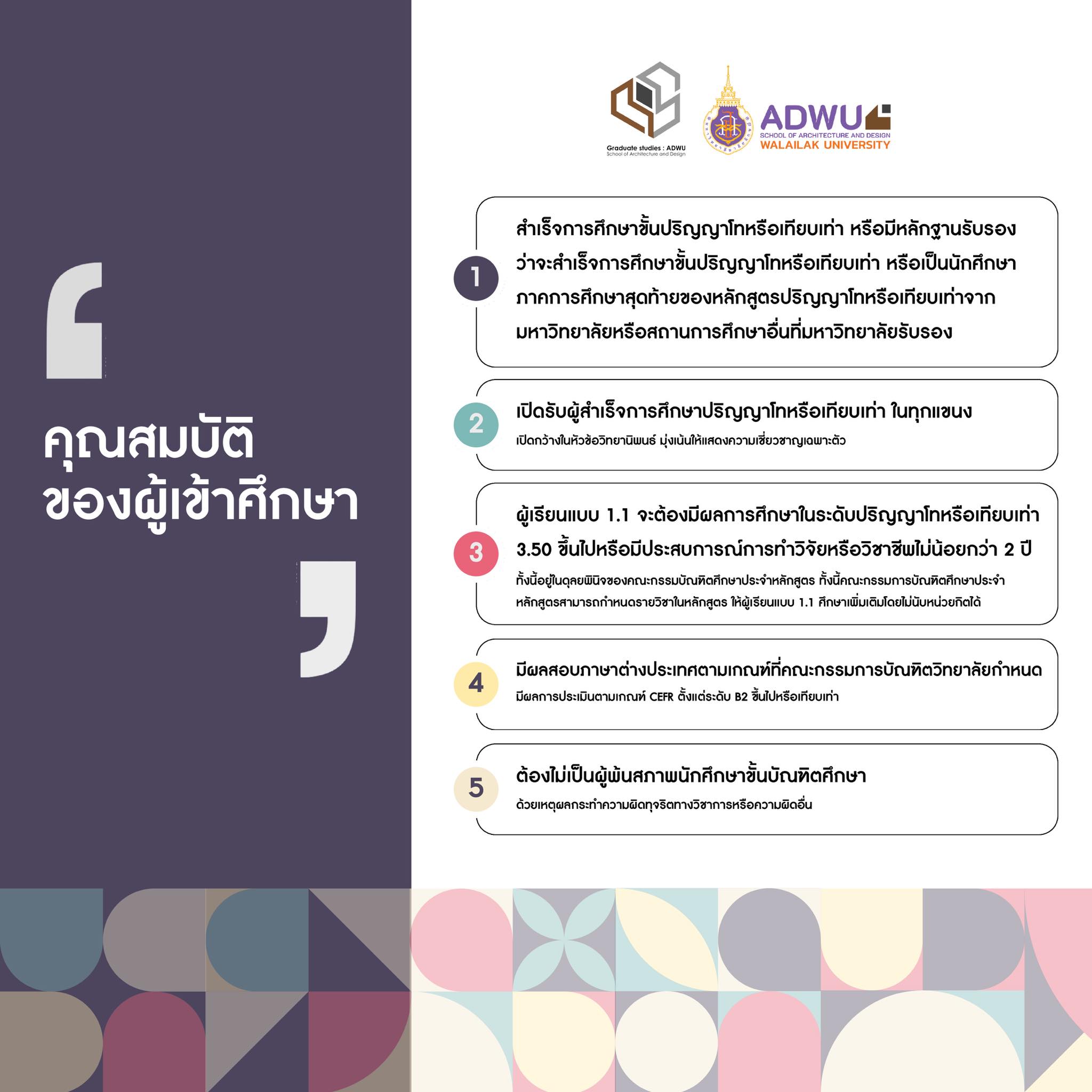 2. เปิดรับผู้สำเร็จการศึกษาปริญญาโทหรือเทียบเท่า ในทุกแขนง เปิดกว้างในหัวข้อวิทยานิพนธ์ มุ่งเน้นให้แสดงความเชี่ยวชาญเฉพาะตัว