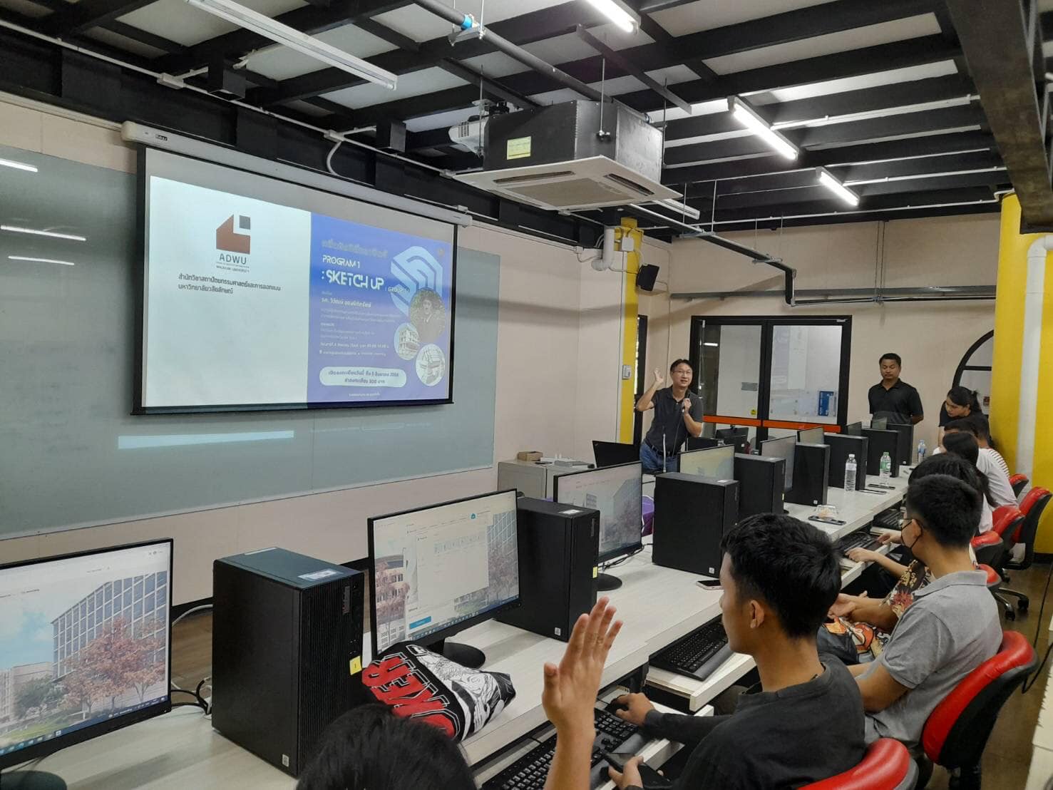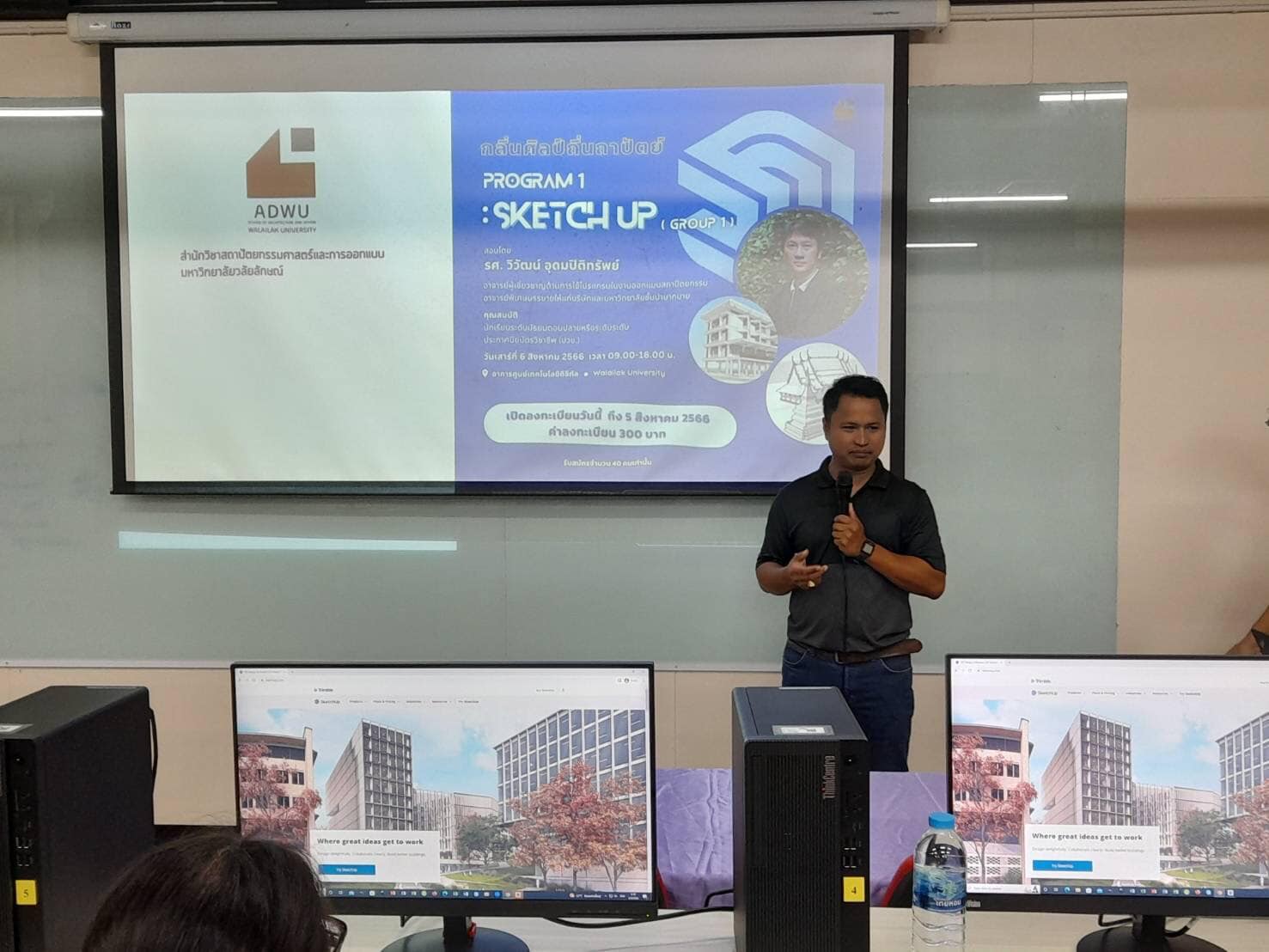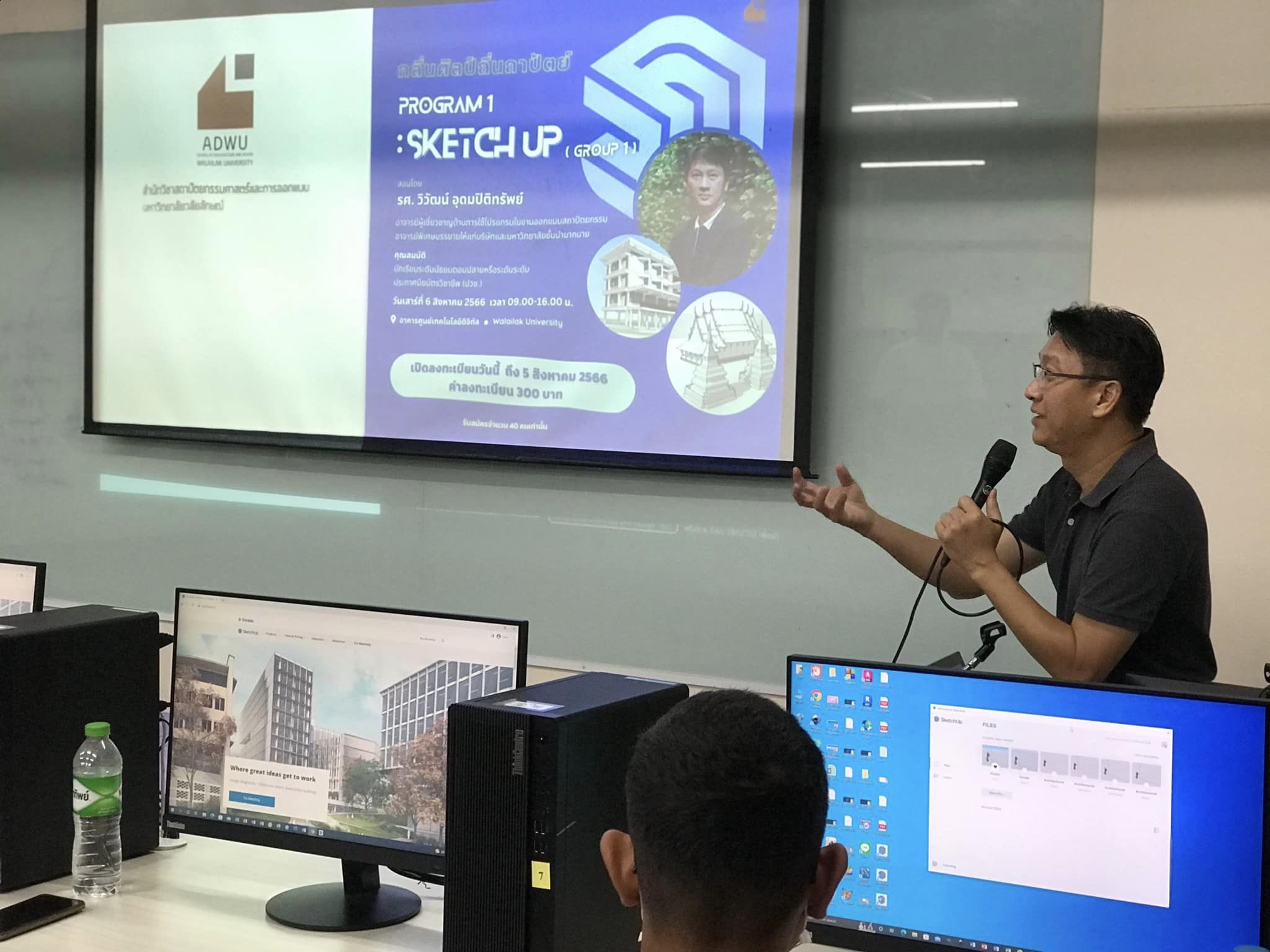 บรรยากาศกิจกรรม กลิ่นศิลป์ ถิ่นถาปัตย์ “Sketch up_Program 1“ โดย รองศาสตราจารย์วิวัฒน์ อุดมปิติทรัพย์ ซึ่งกิจกรรมนี้ประกอบด้วย การสอนการใช้โปรแกรม Sketch up เบื้องต้น การขึ้นรูปงานสถาปัตยกรรม เพื่อเป็นพื้นฐานในการนำไปใช้ในการเรียนด้านสถาปัตยกรรมและการออกแบบต่อไป และเป็นกิจกรรมในซี่รีย์ของกับฝึกทักษะโปรแกรมคอมพิวเตอร์ที่เป็นพื้นฐานให้น้องๆระดับมัธยมศึกษาตอนปลายที่สนใจจะเข้าศึกษาในสายสถาปัตยกรรมและการออกแบบ โดยสำนักวิชาเรามีเครื่องมือการเรียนที่ดีทันสมัย ใช้โปรแกรมสิขสิทธิ์ และอนาคตจะเป็นศูนย์ up skills and rekill