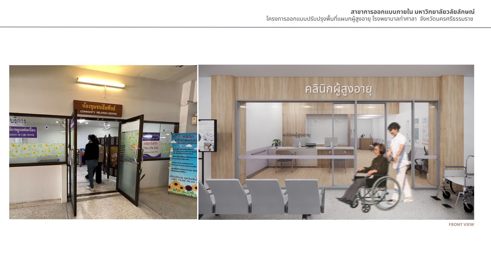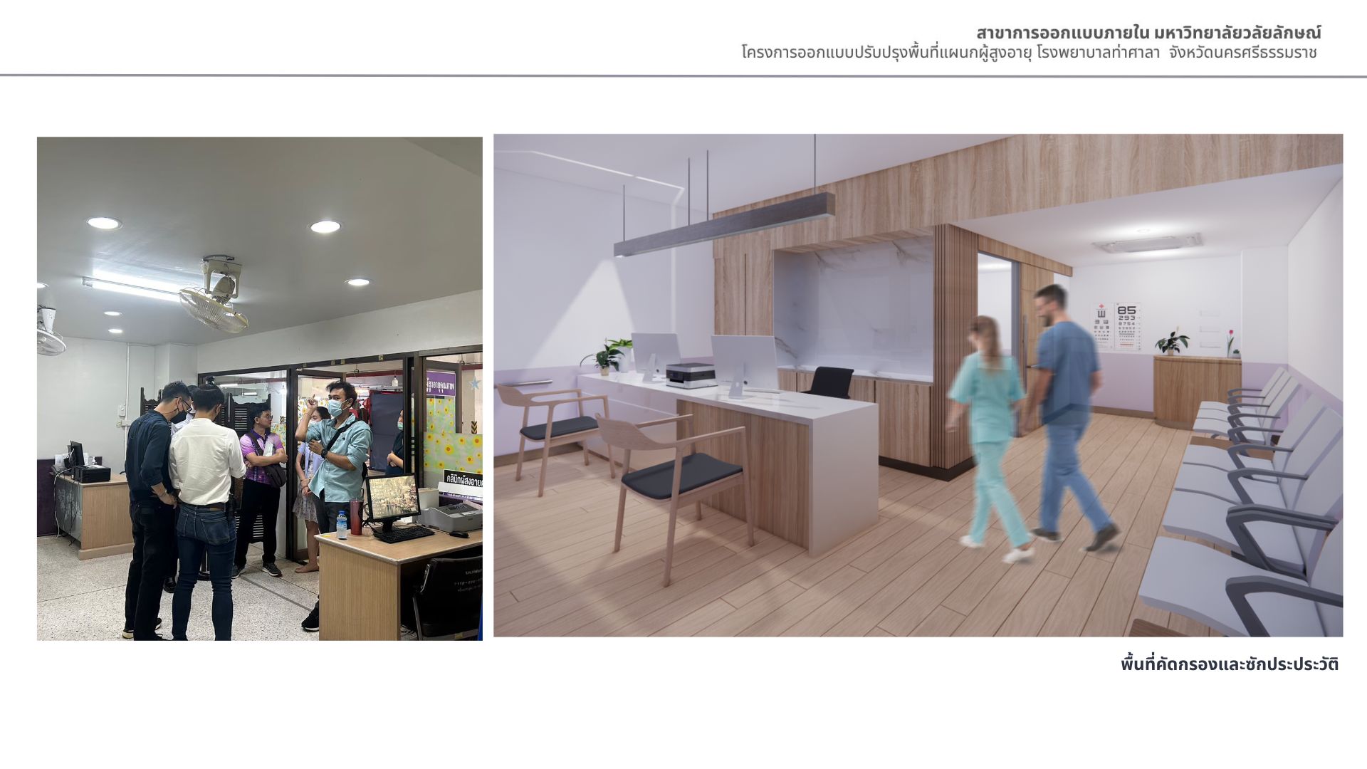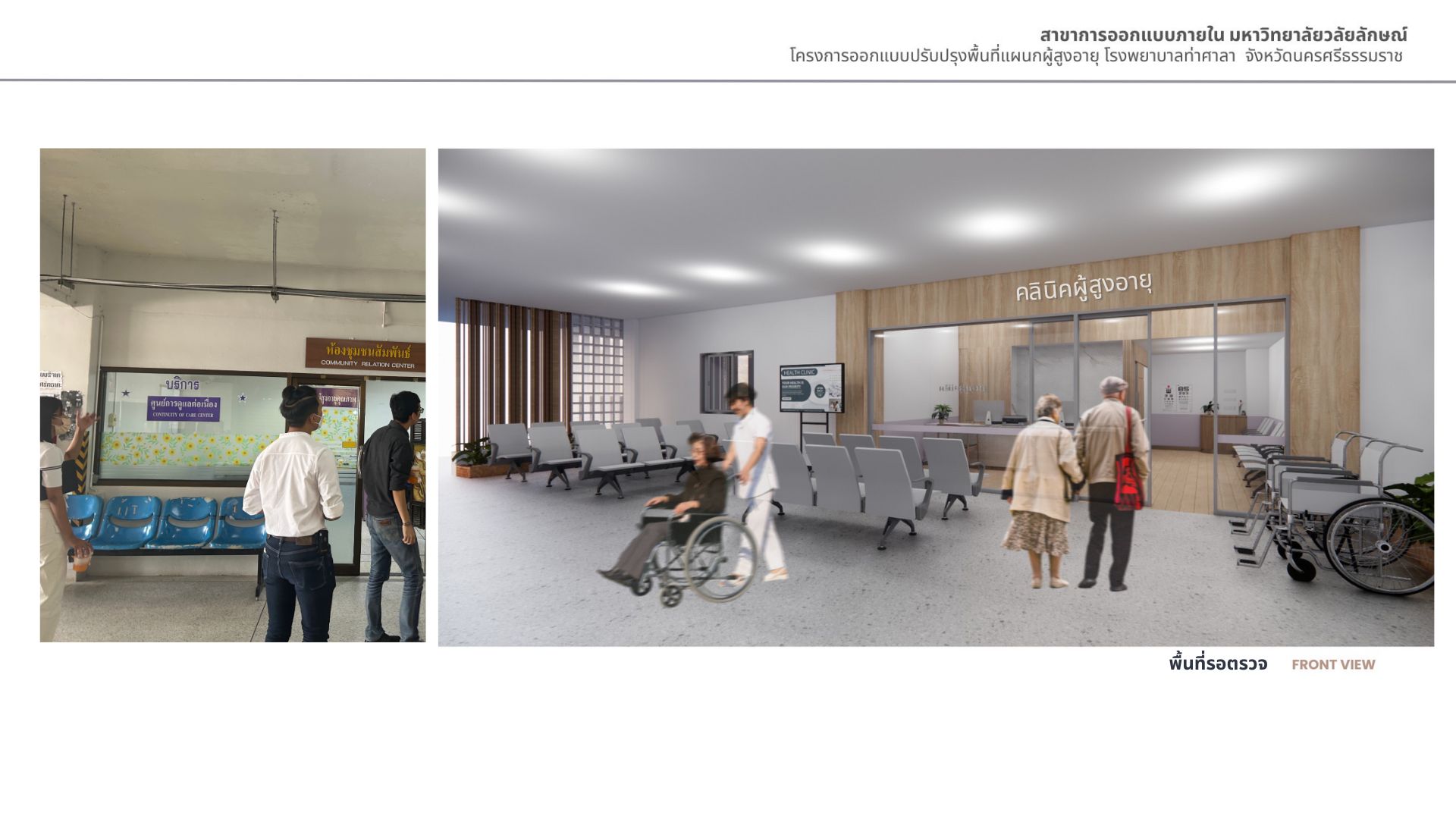 สำนักวิชาสถาปัตยกรรมศาสตร์และการออกแบบ สาขาการออกแบบภายใน นำโดย อาจารย์สุริณี กิ่งกาด หัวหน้าโครงการ และทีมคณาจารย์สาขาออกแบบภายใน ได้รับการประสานงานจากโรงพยาบาลท่าศาลาจากความต้องการปรับปรุงพื้นที่บริเวณชั้น 1 เป็นคลินิกผู้สูงอายุ โดยสาขาการออกแบบภายในได้เข้าไปมีส่วนร่วมในการออกแบบคลินิกผู้สูงอายุใน “โครงการออกแบบปรับปรุงพื้นที่แผนกผู้สูงอายุ โรงพยาบาลท่าศาลา จังหวัดนครศรีธรรมราช”